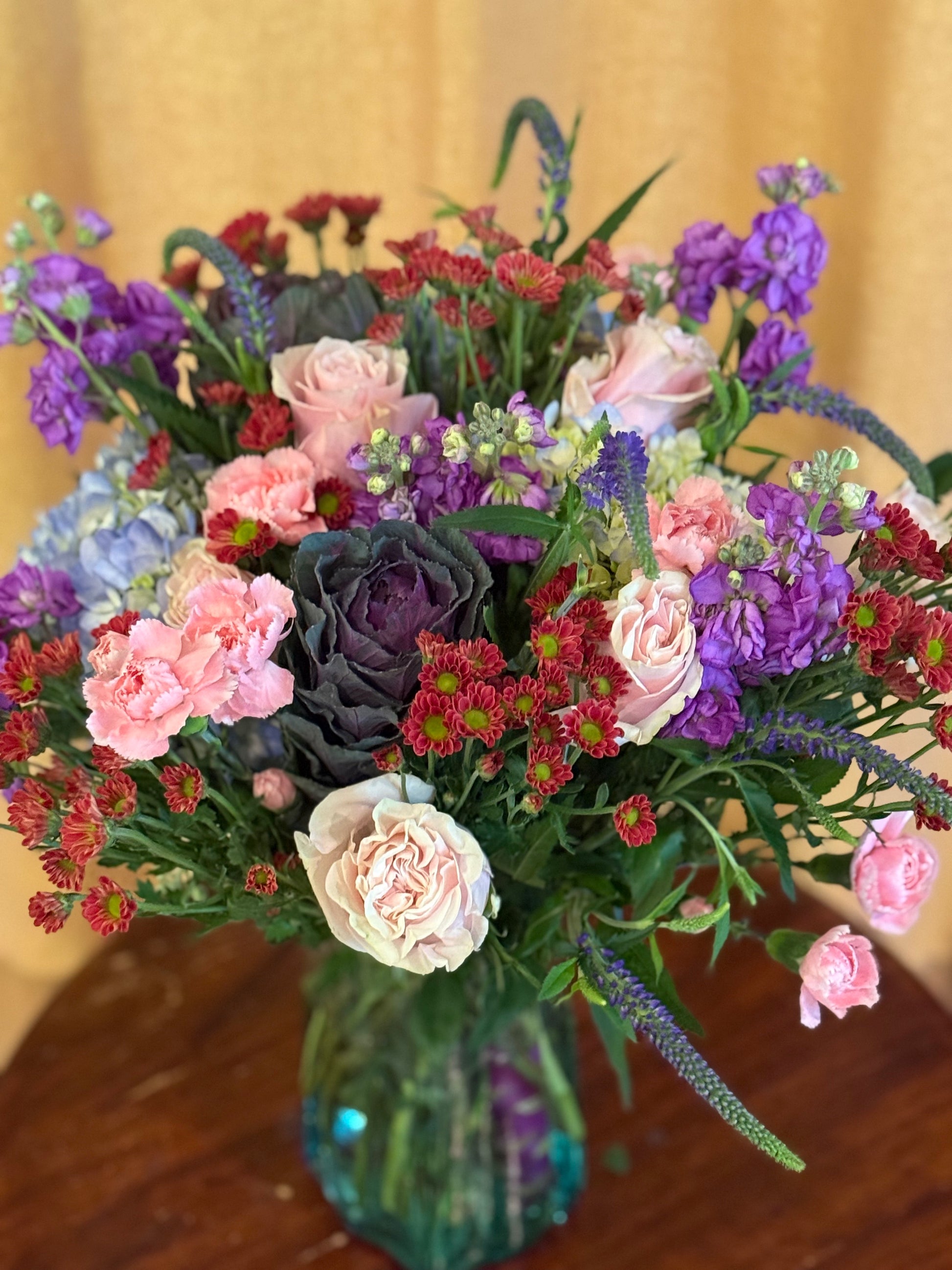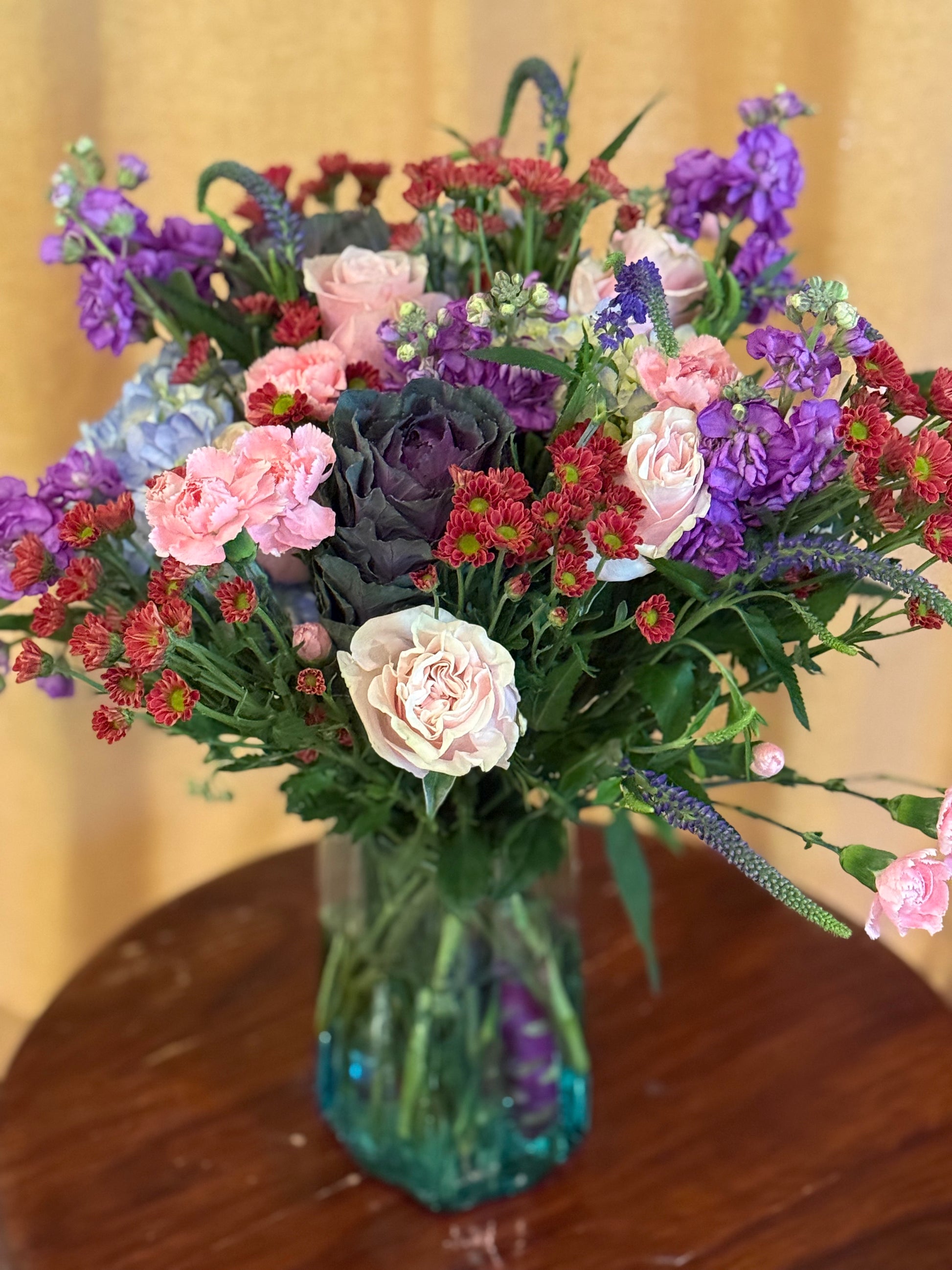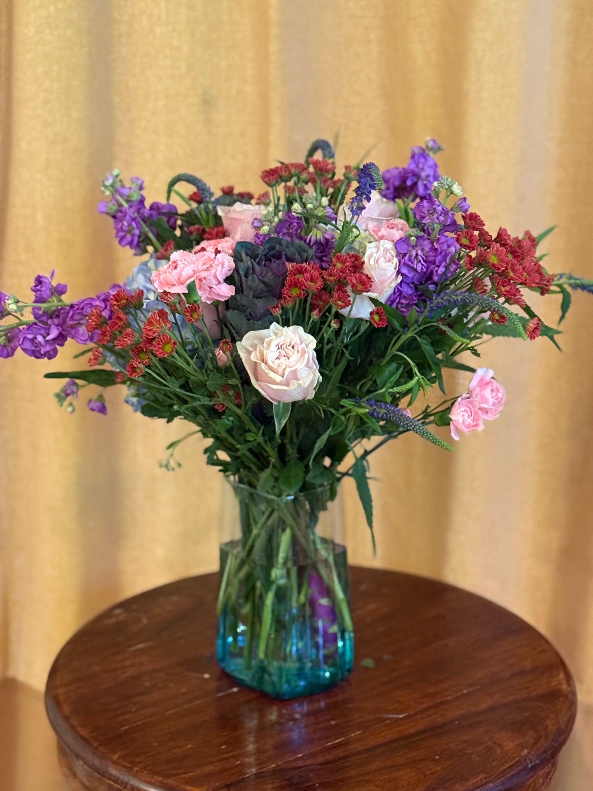 A beautiful recycled glass wave vase filled with an abundance of all our best flowers! Multicolored and fragrant.