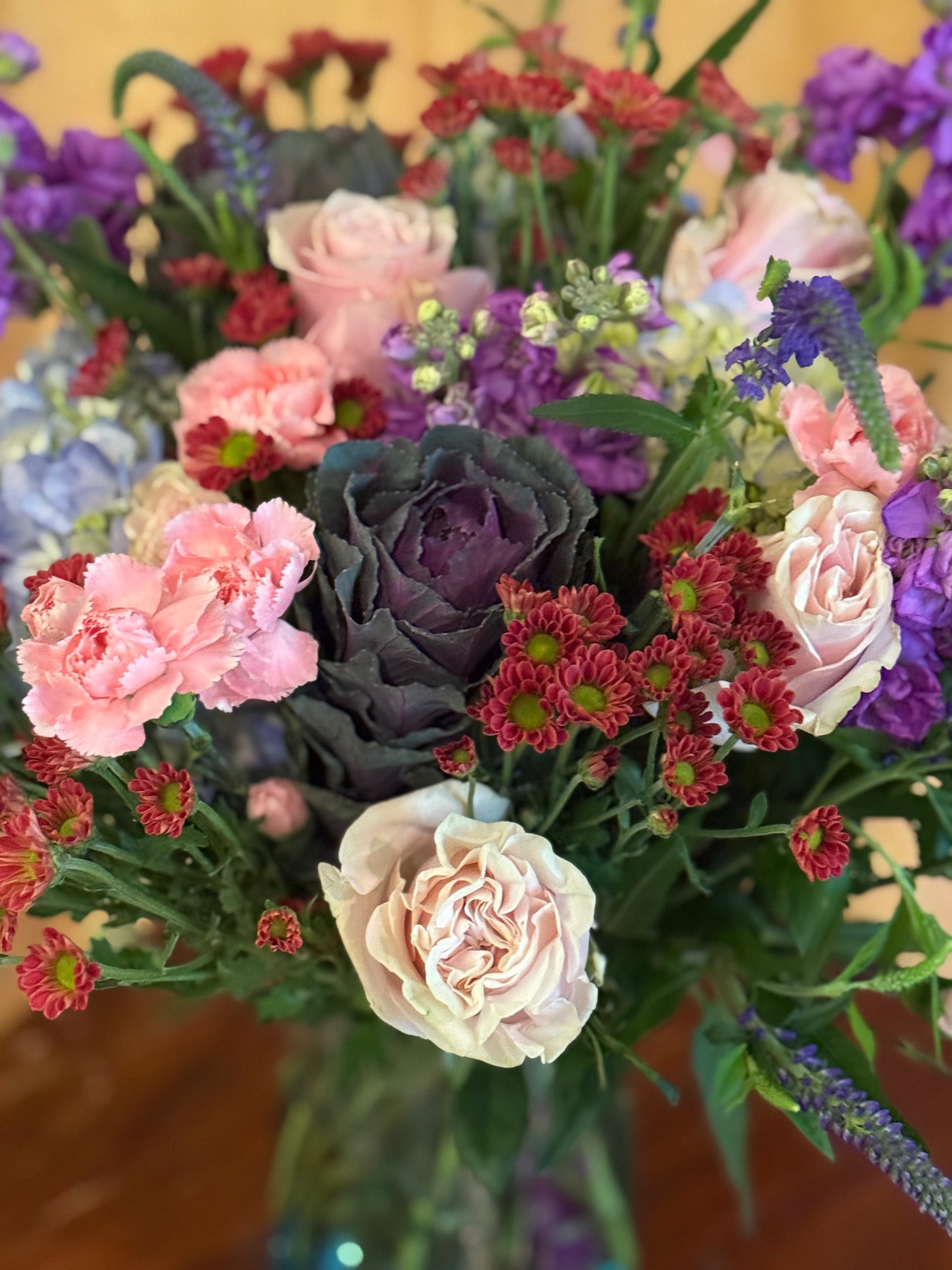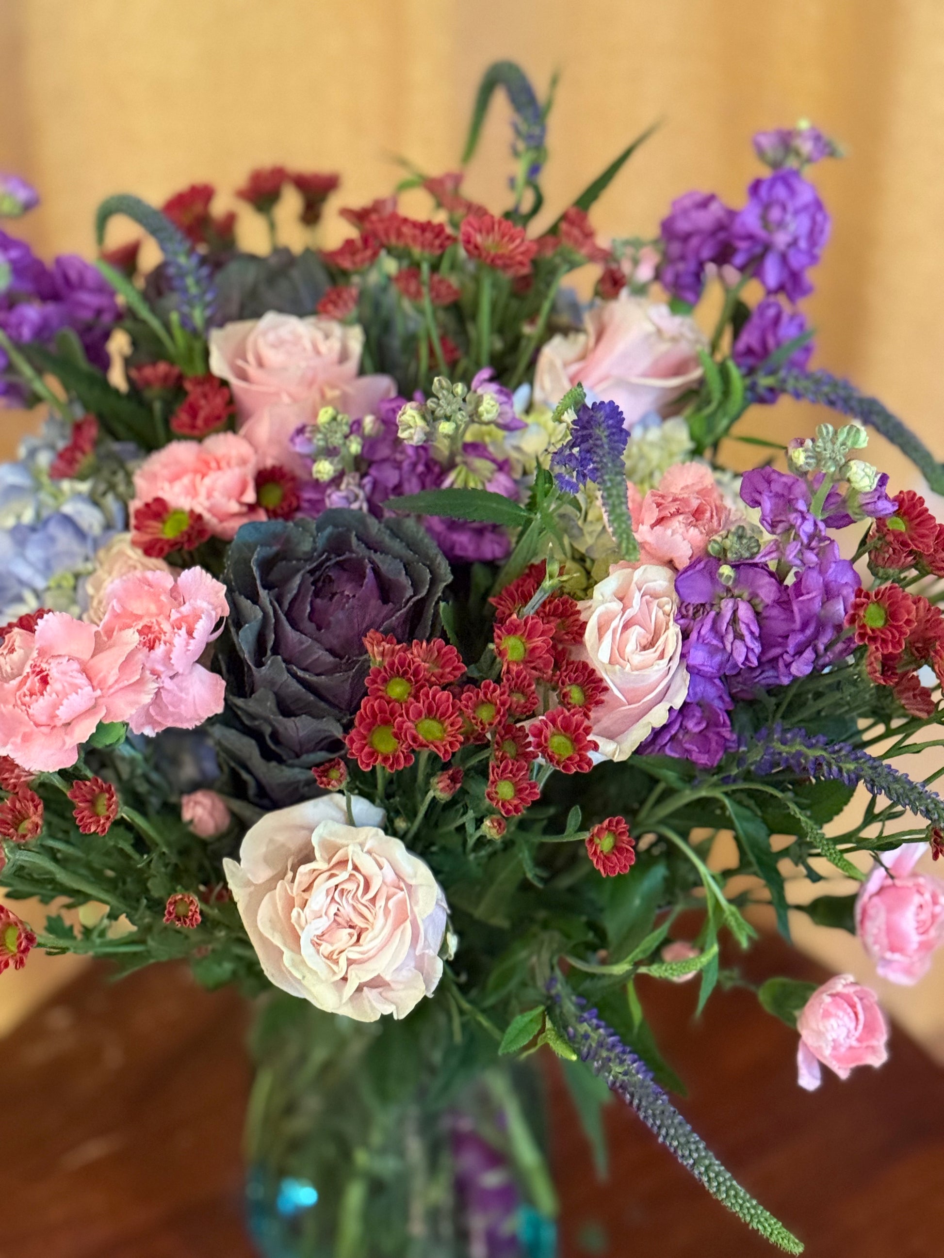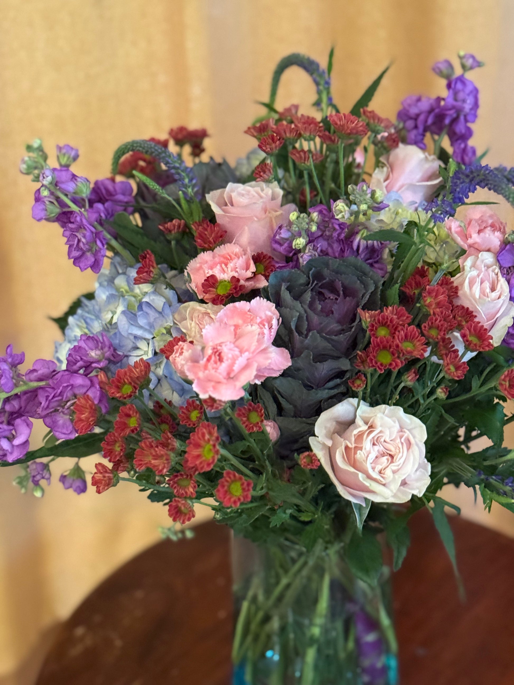 A beautiful recycled glass wave vase filled with an abundance of all our best flowers! Multicolored and fragrant.