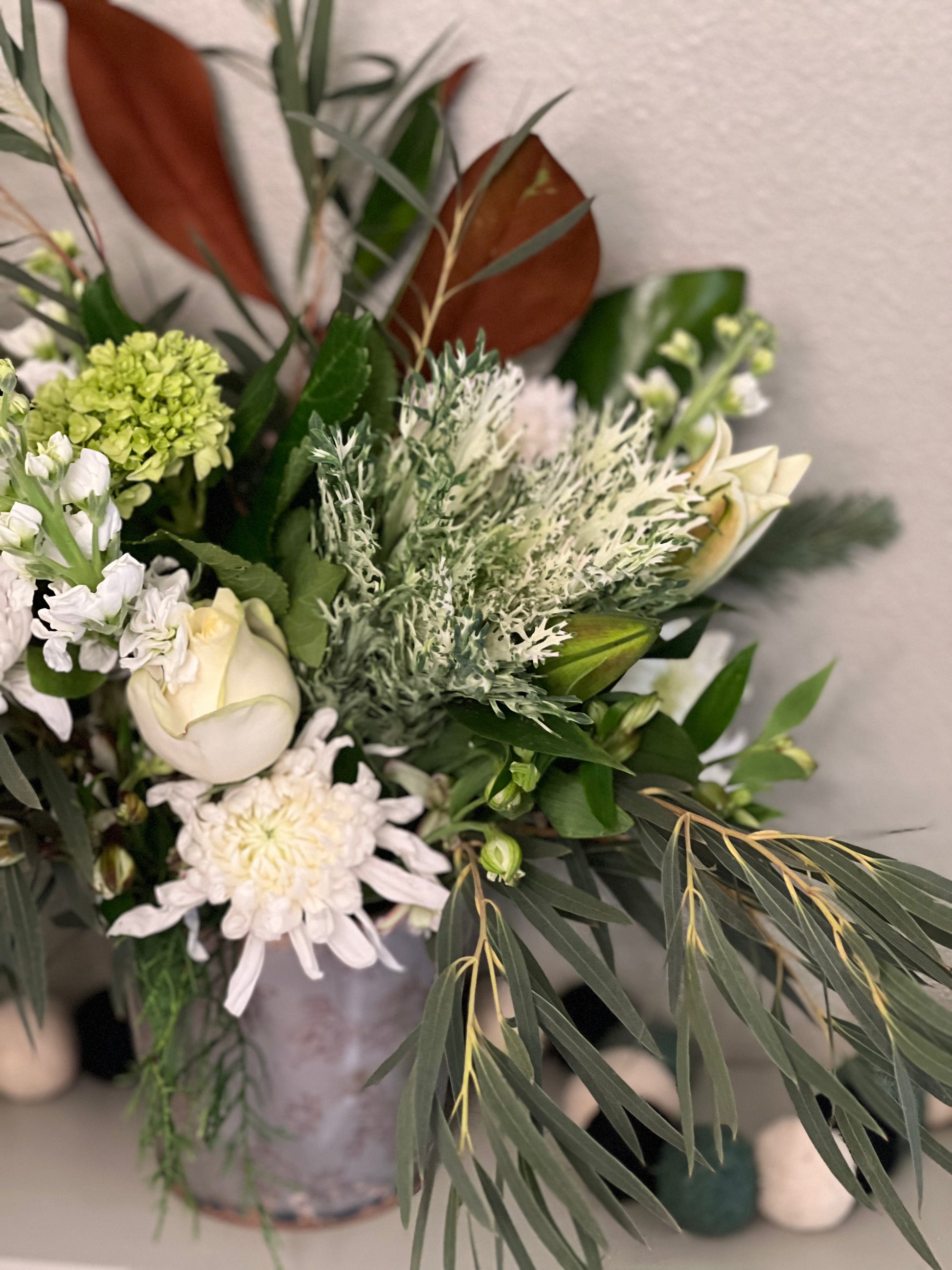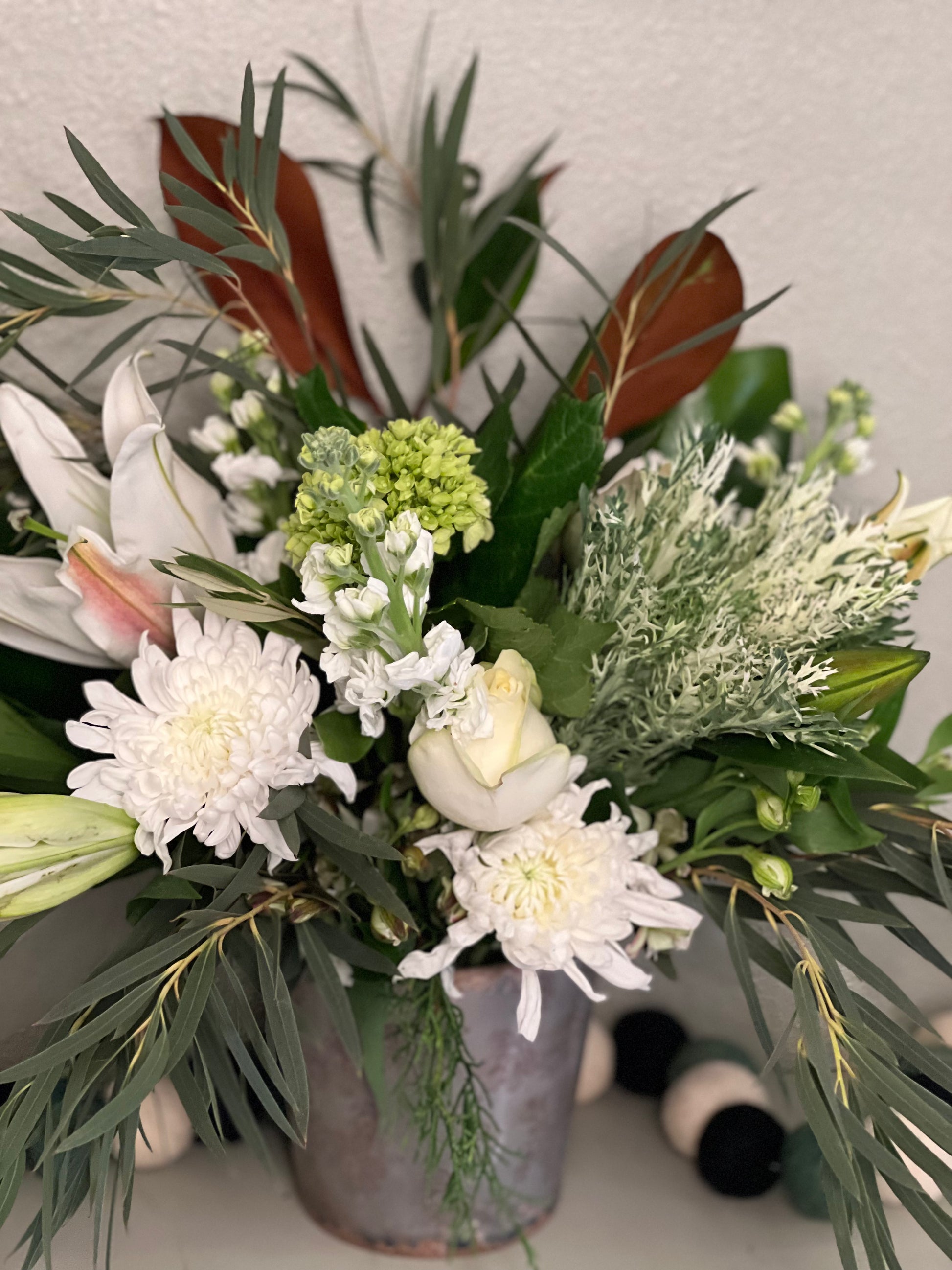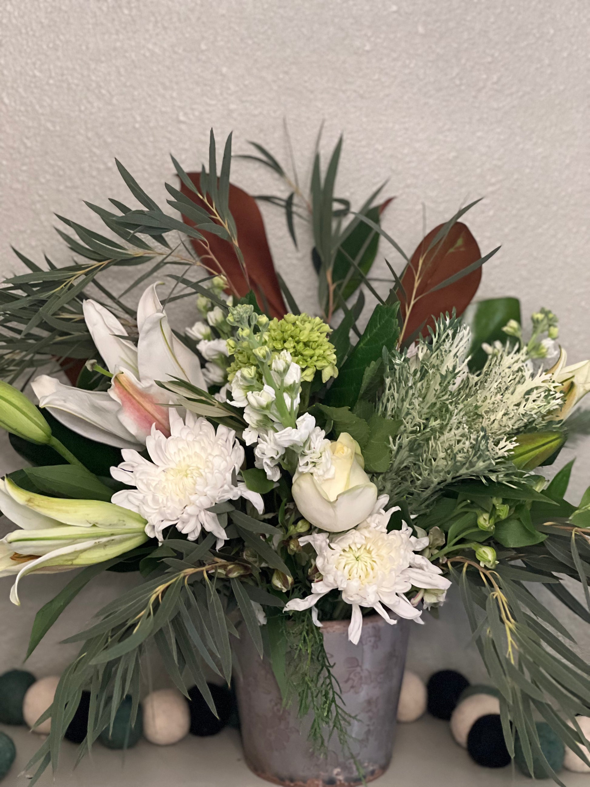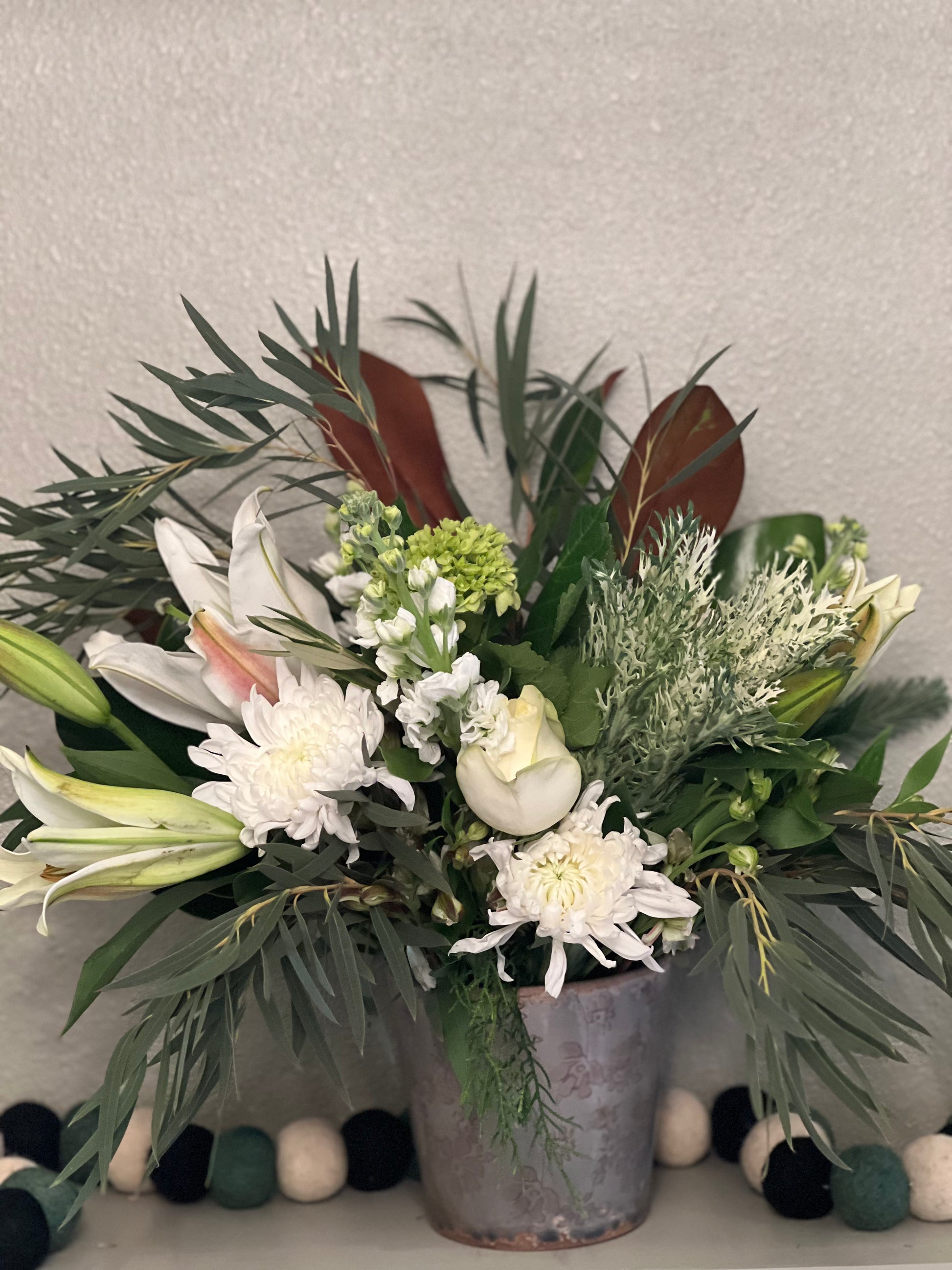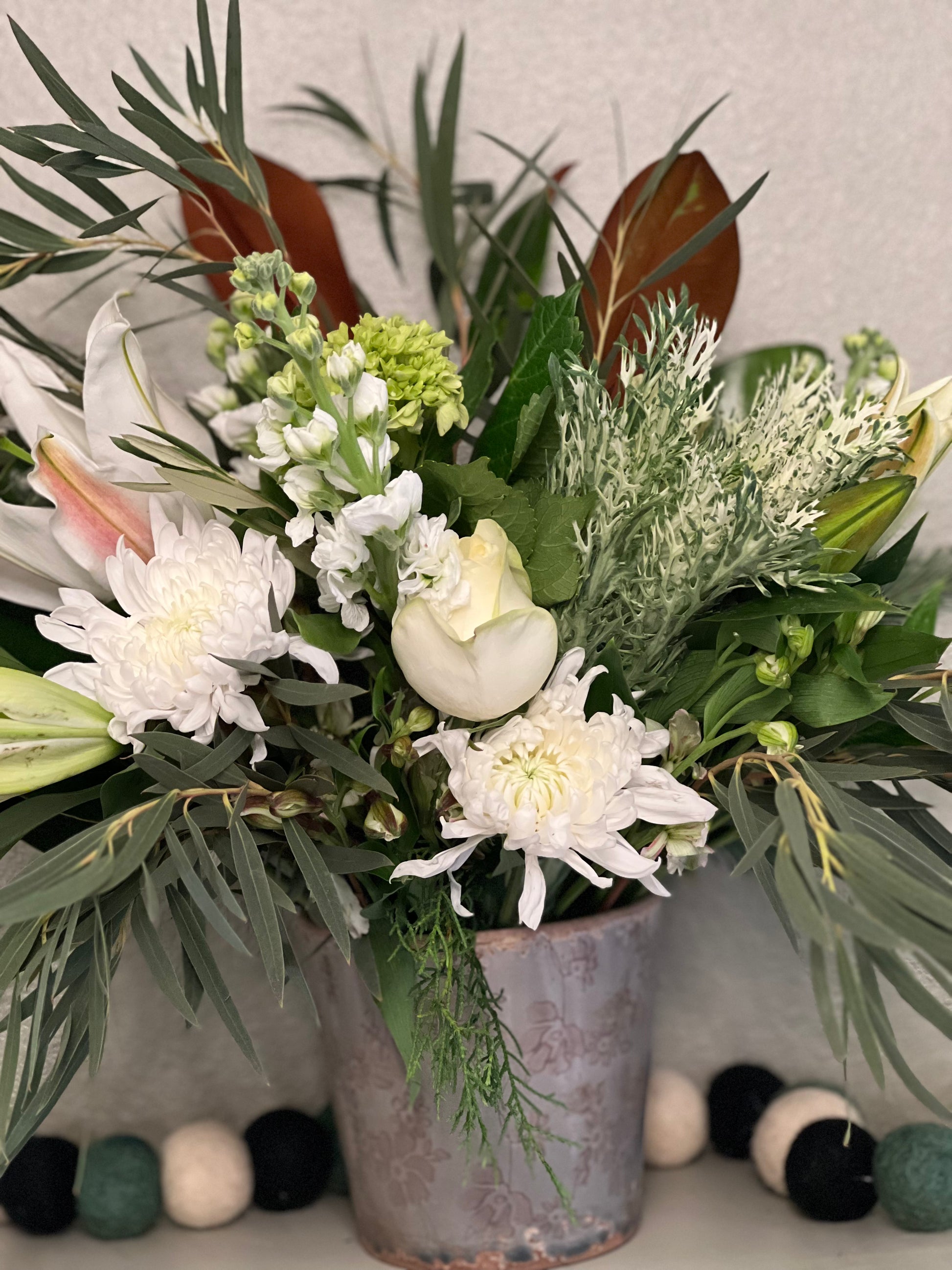 Floral patterned, old world blue pot, filled with all white flowers ( usually including lilies) and fragrant greens.