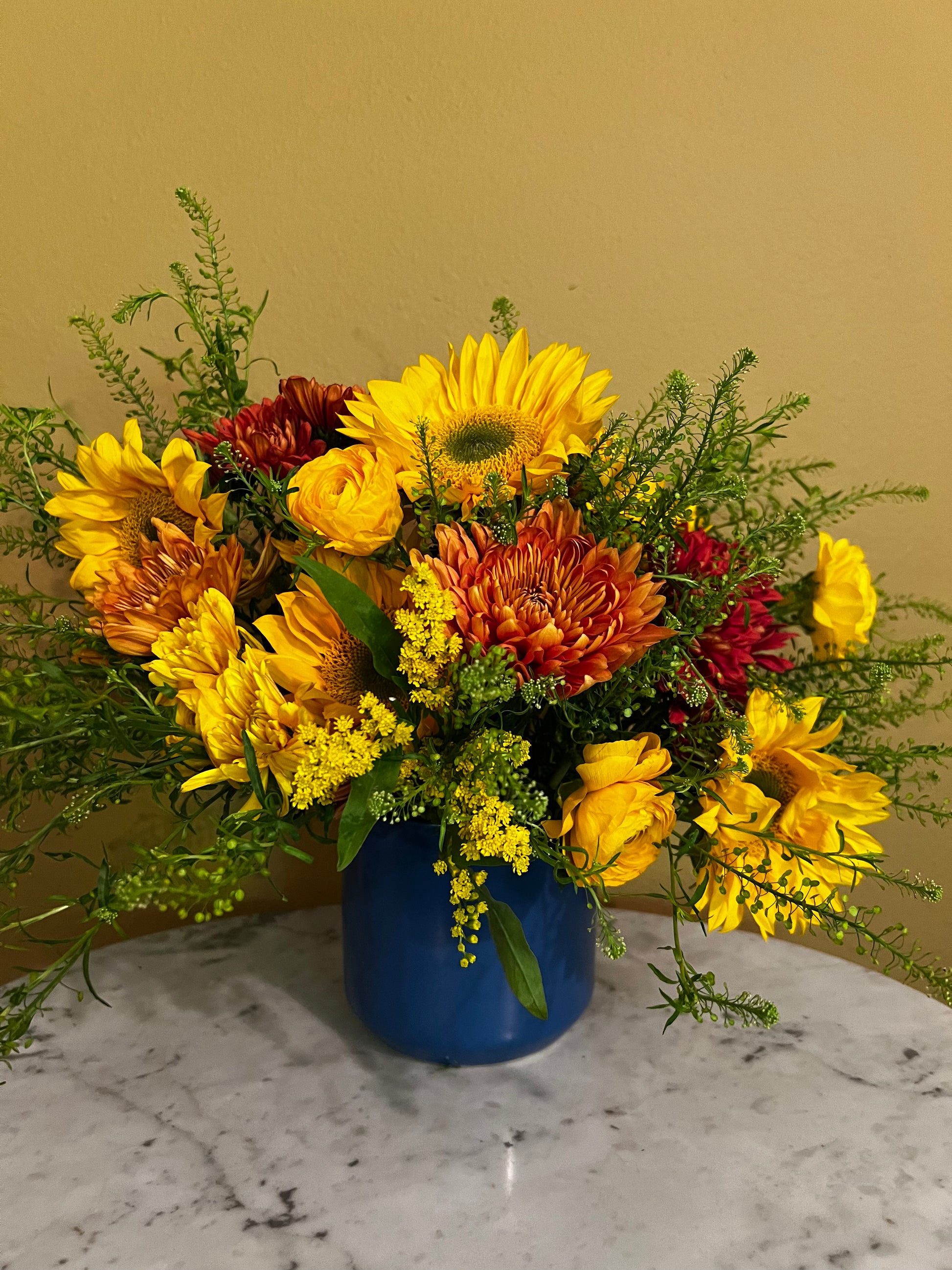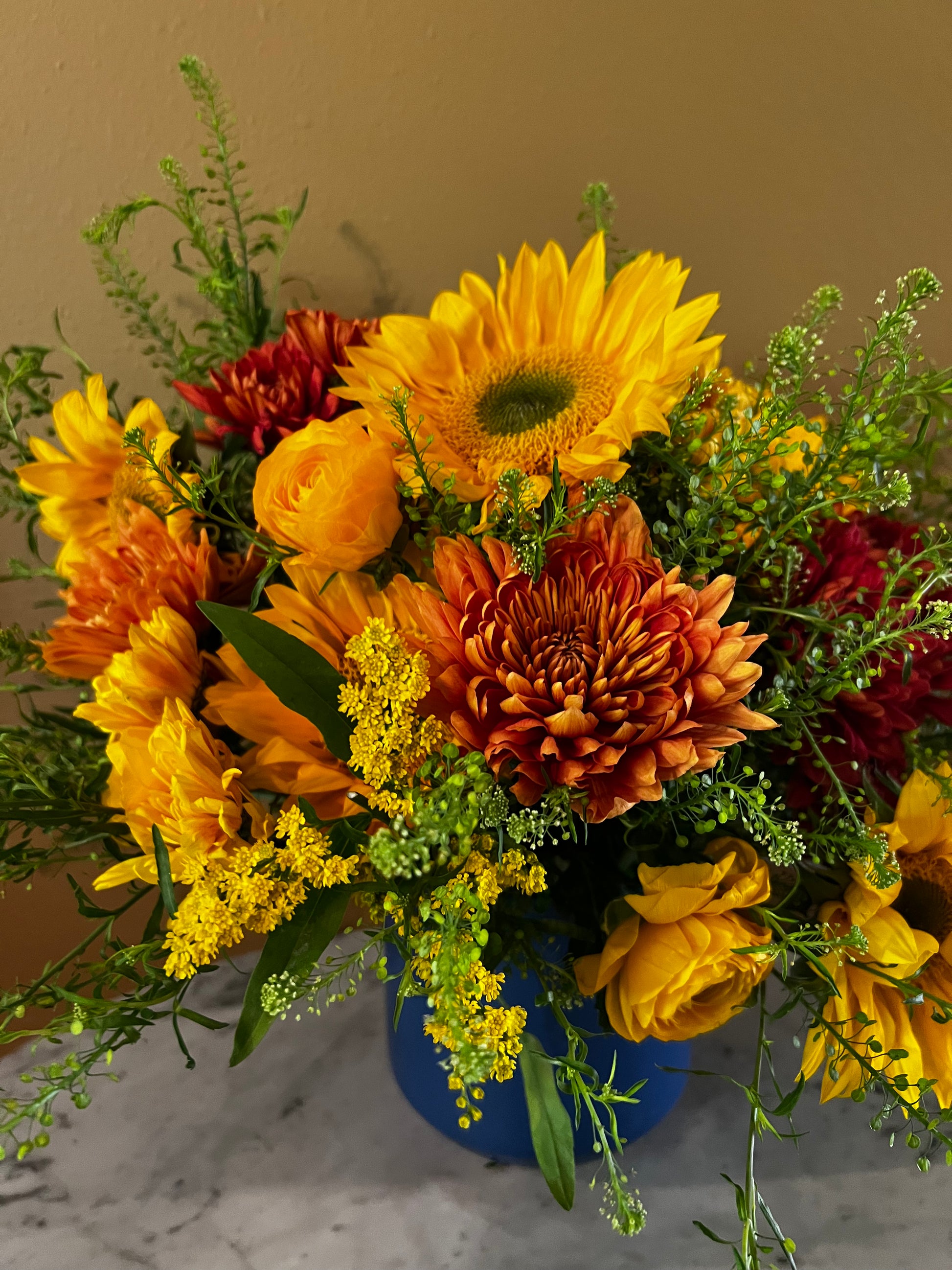 Gold, rust, yellow, and orange tone flowers rest easy in a deep blue pot that can be used later as a planter.