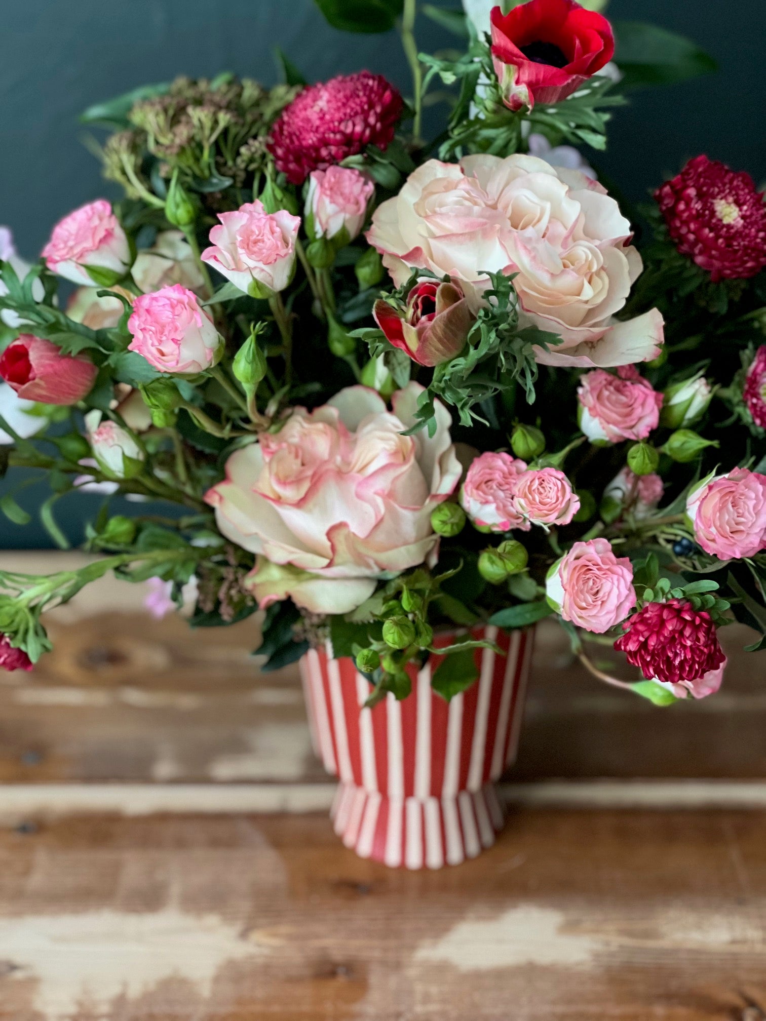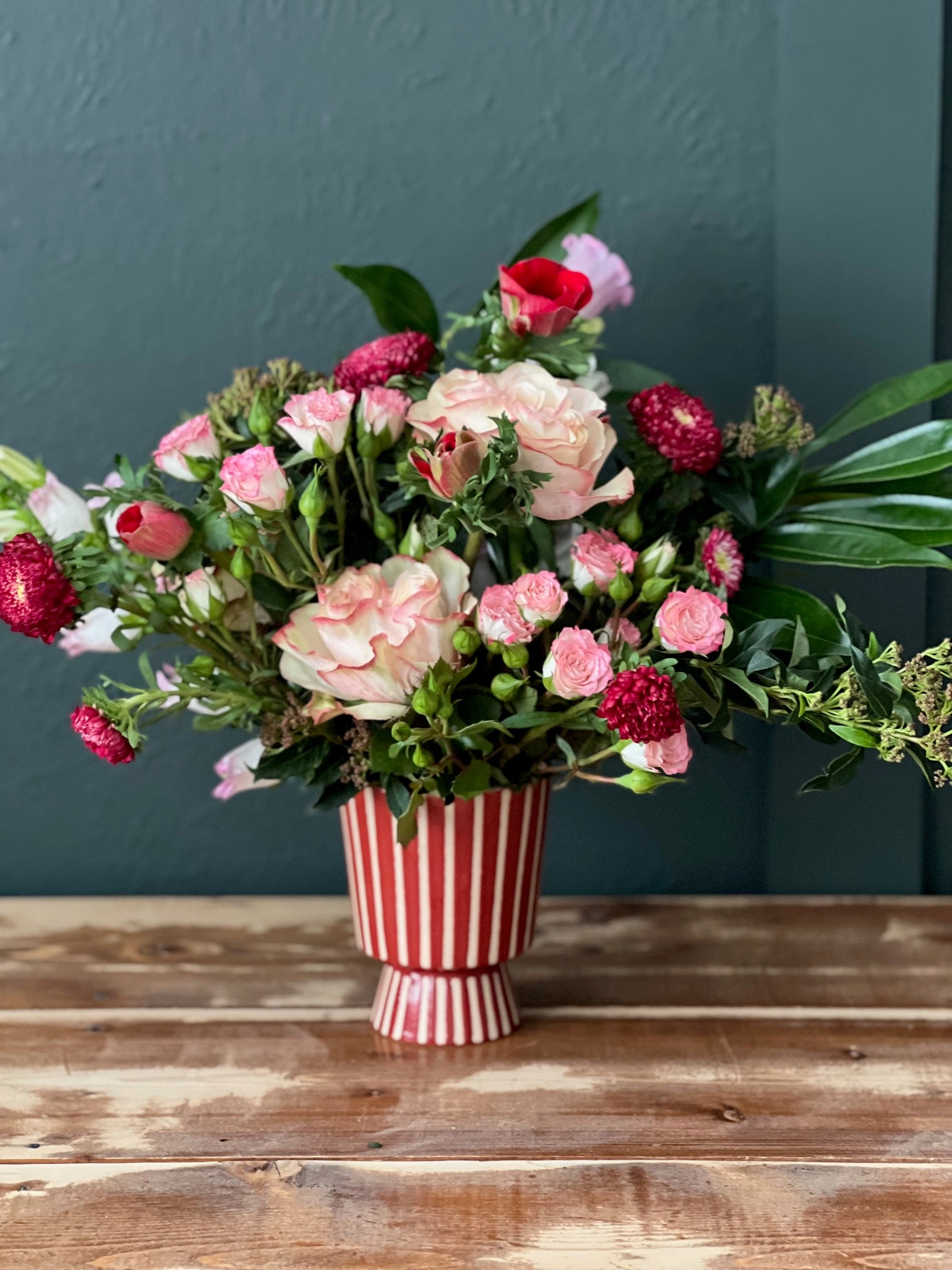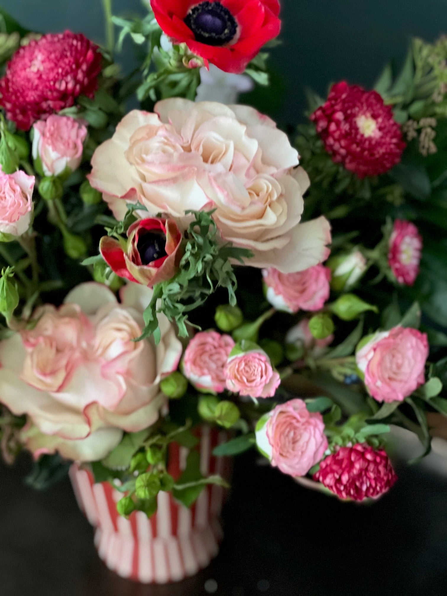 * Red striped vase filled with pink, red and white flowers. The rufflier the better!