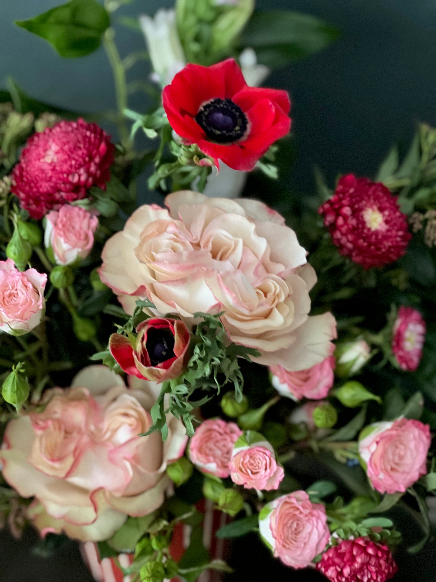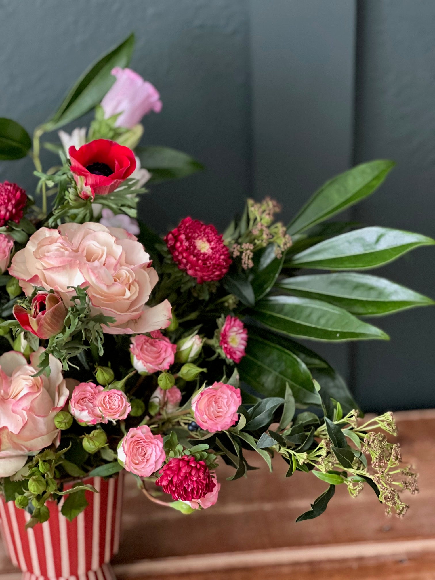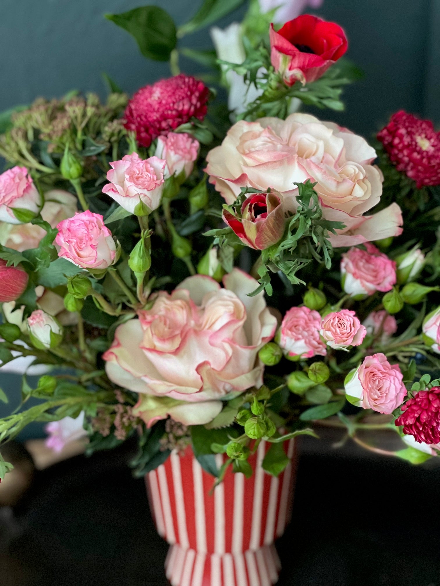 * Red striped vase filled with pink, red and white flowers. The rufflier the better!