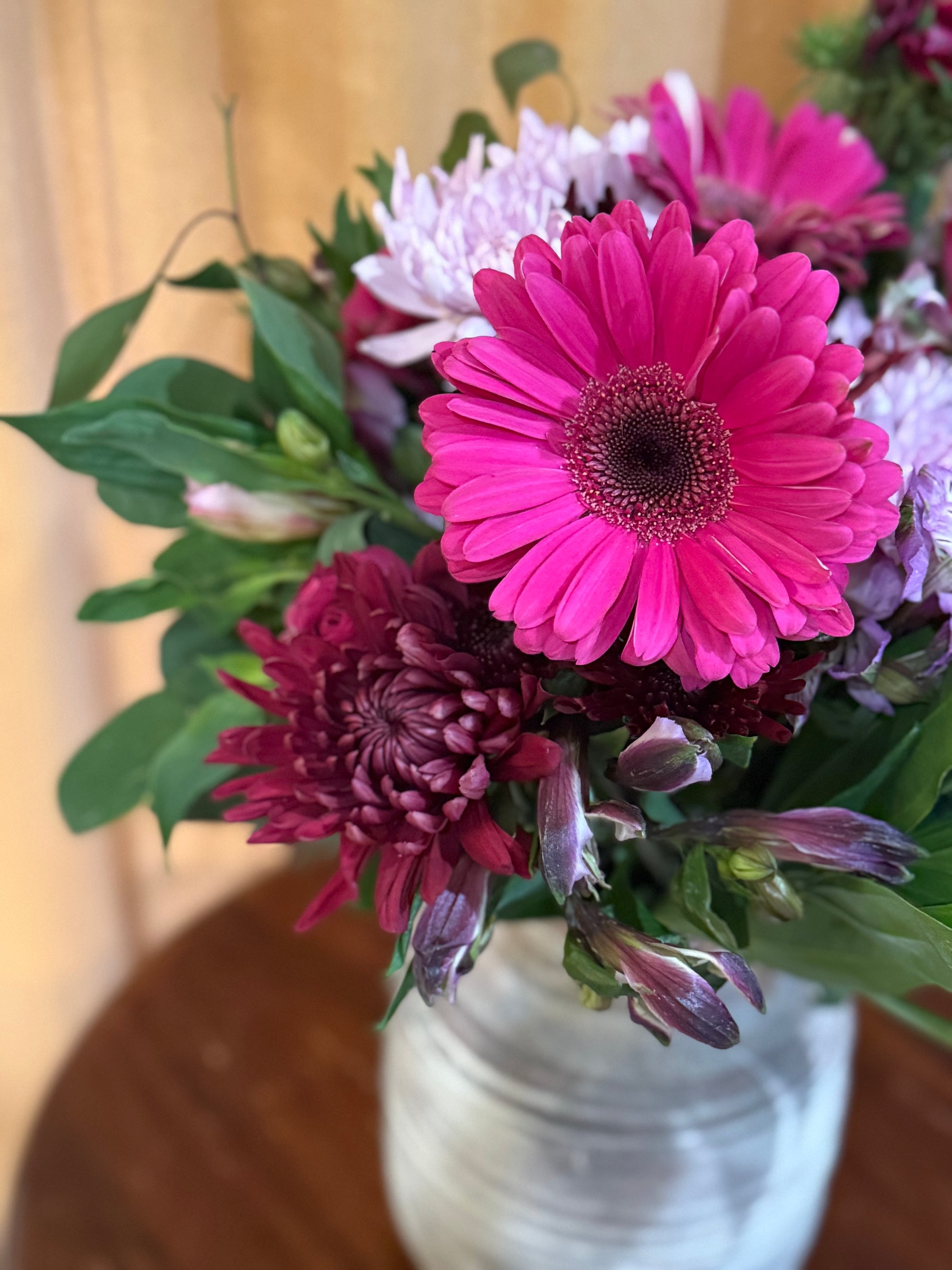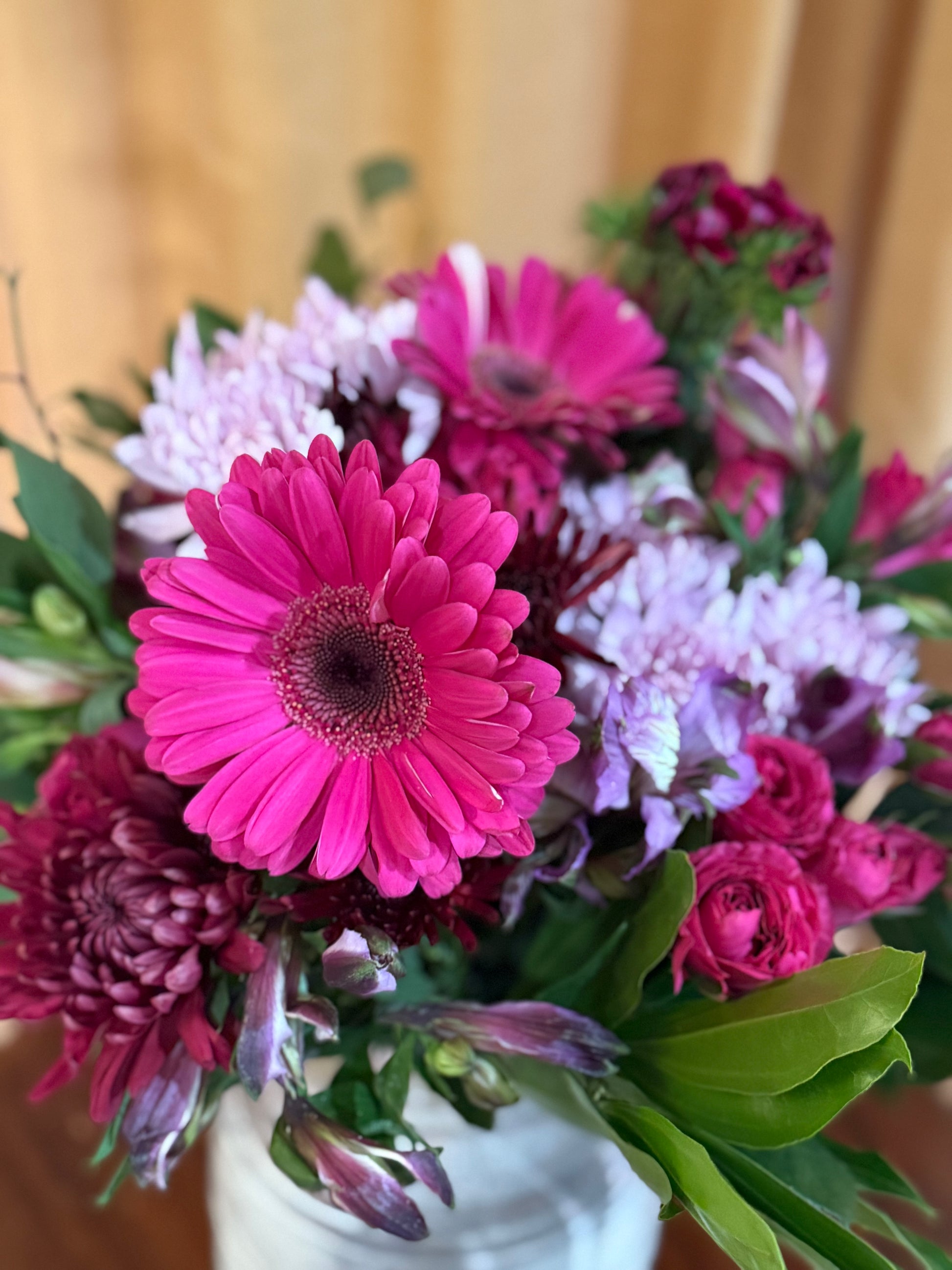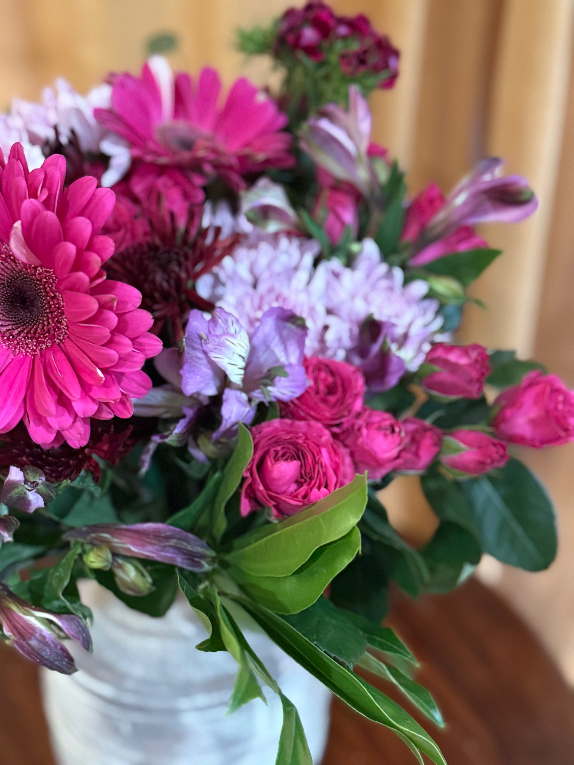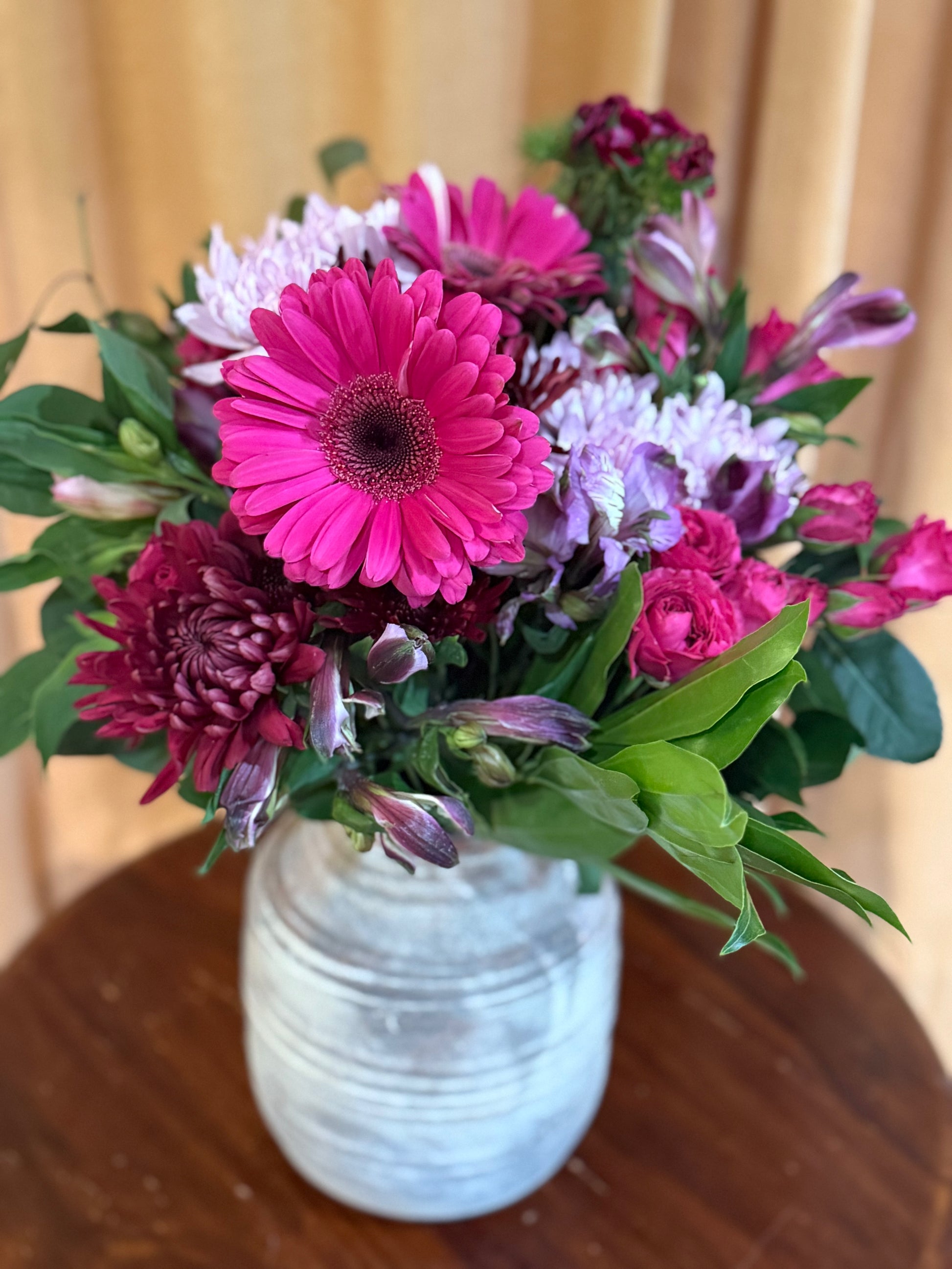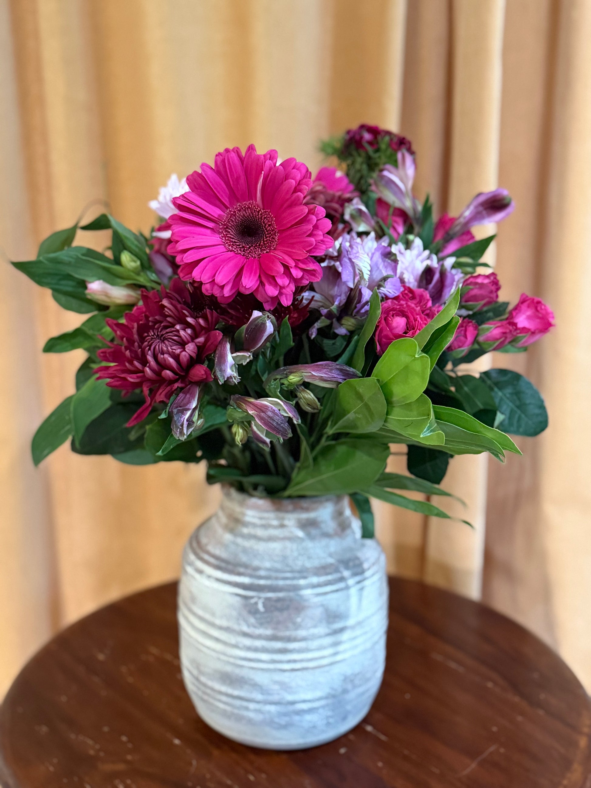 *Vintage finished terracotta vase vase filled with jewel tone pink and purple flowers.