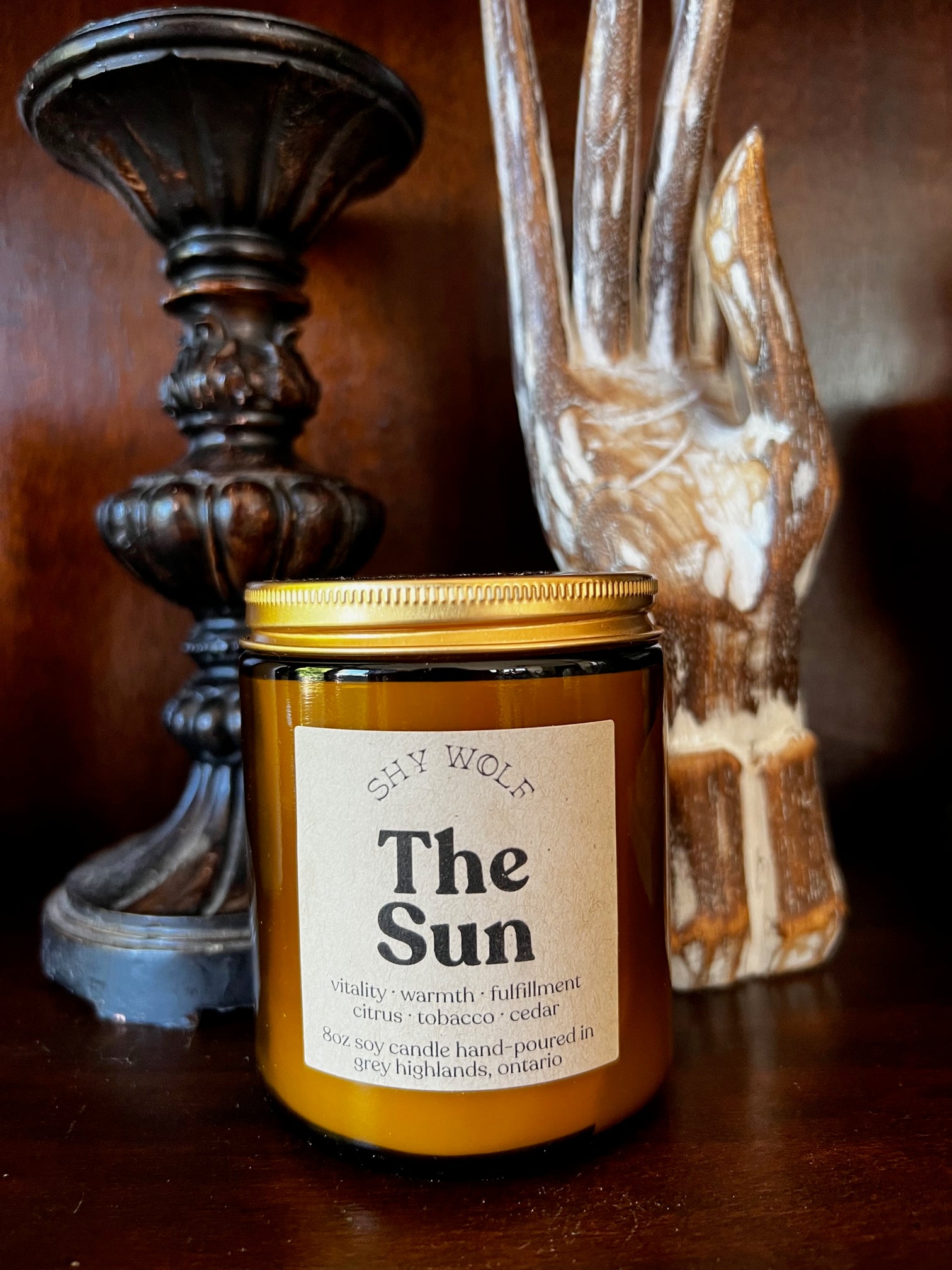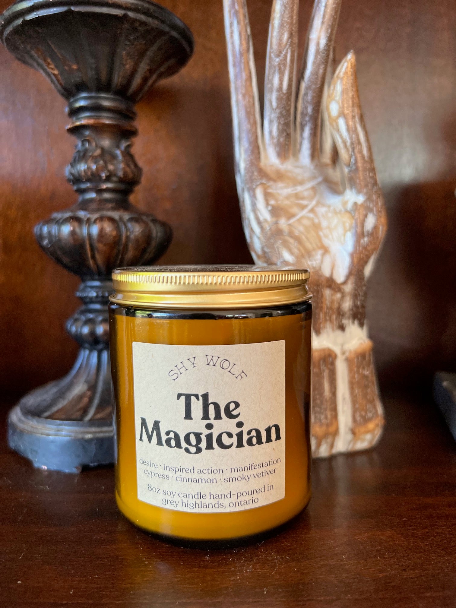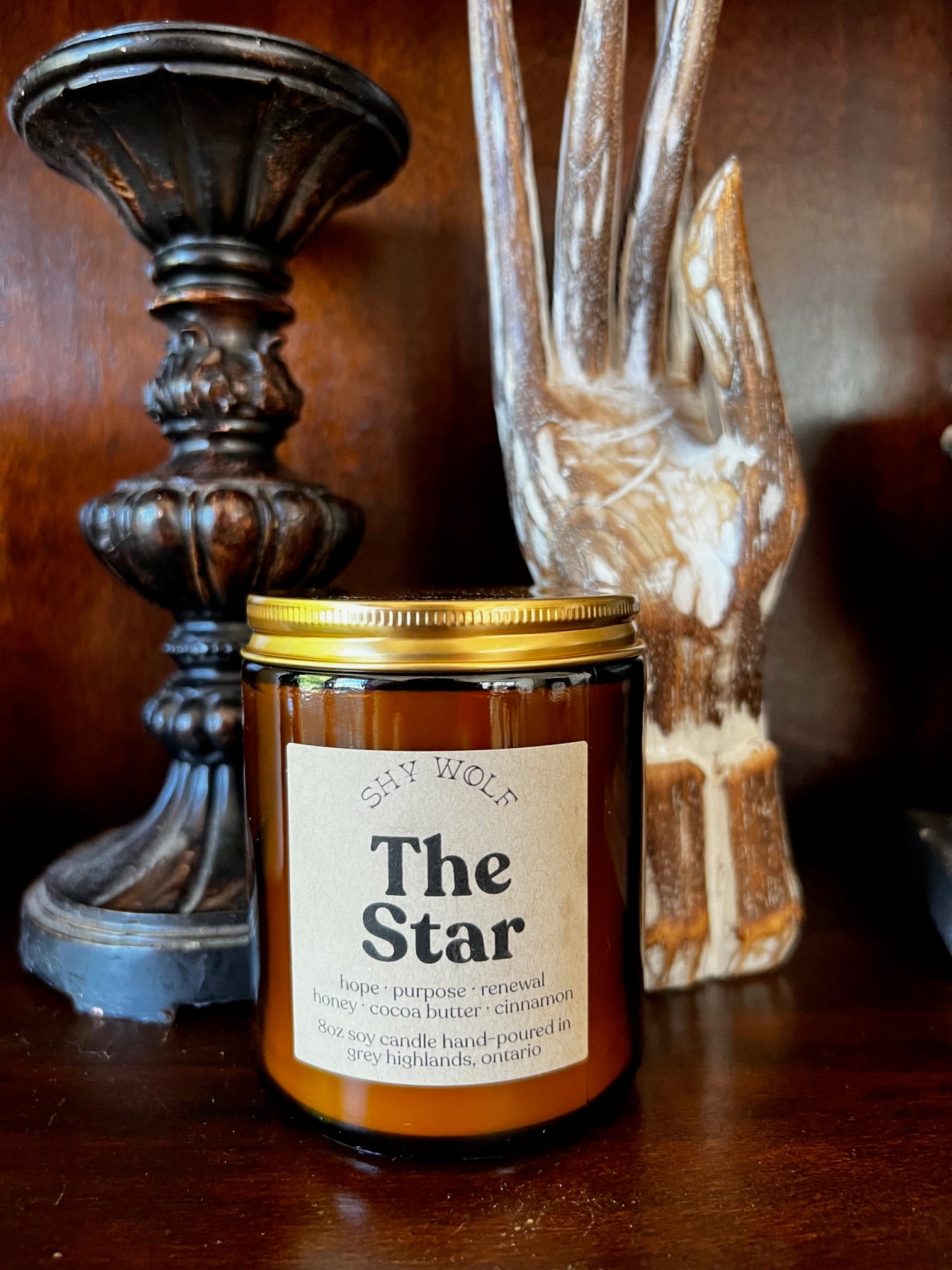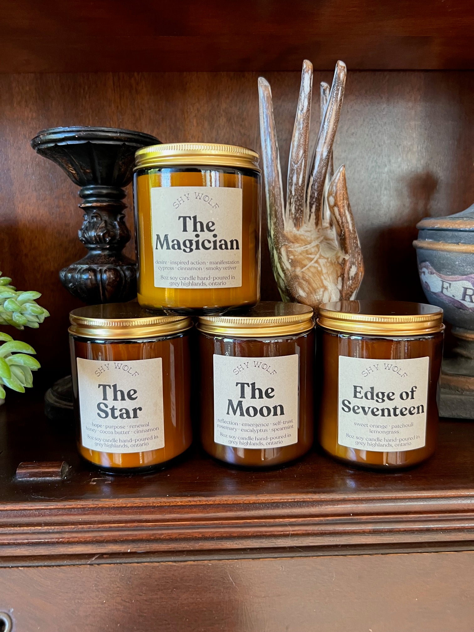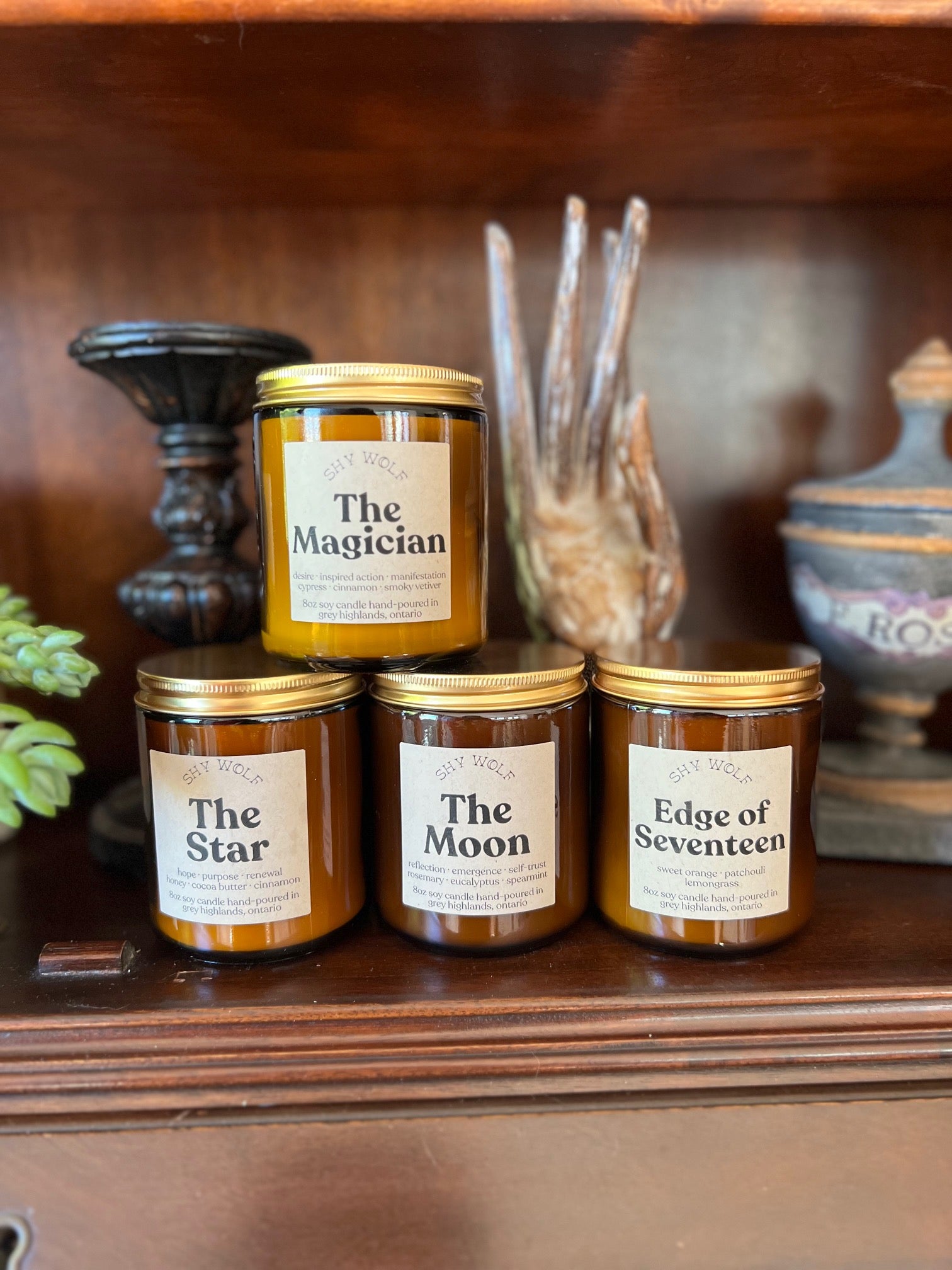Hand poured in Grey Highlands, Ontario, sustainably crafted with soy wax, cotton wicks, and a custom blend of natural scents inspired by classic rock and the tarot. Phthalate free, 8oz